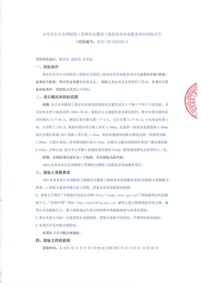 保标招标 > 水利枢纽 > 招标信息 > 永寿县东庄水利枢纽工程移民安置竣工验收技术咨询服务项目招标公告